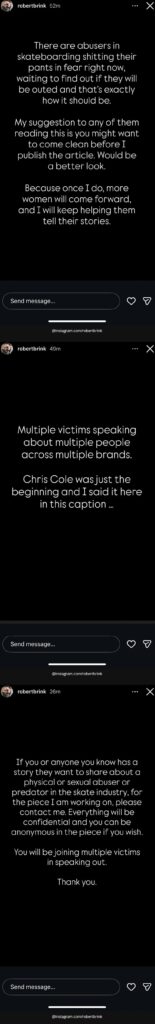 Brink’s work is focused on giving victims a platform to safely share their stories, encouraging more people to come forward and ensuring their voices are heard. This project is not limited to a single person or incident. It encompasses multiple victims and multiple alleged perpetrators, revealing a pattern of abuse that spans years and affects different areas of the skateboarding scene.